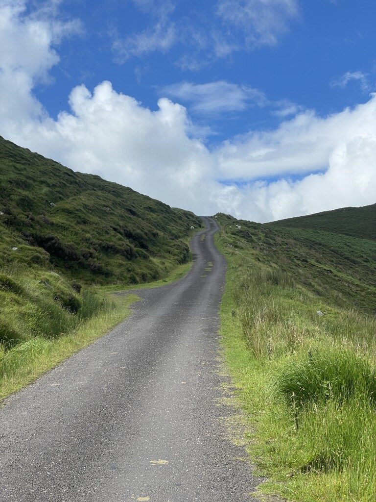Arriving back at sea level, we did not spend much time before reaching the community of Camp and turning onto the Caherconree Scenic Route. If we thought Conor Pass—or, albeit, any other road in Ireland—was small, this proved otherwise. The road began by climbing through farmland, slowly getting smaller and smaller until we passed through Caherconree itself, where the road became a small path of paved and gravel sections. Our pace was slowed only by the breathtaking scenery and the fact that the road was so narrow we never saw a single car the entire length. After waiting in “Irish traffic”—a group of sheep who refused to veer from the roadway—we completed our loop, coming out on the highway we had started on that morning.