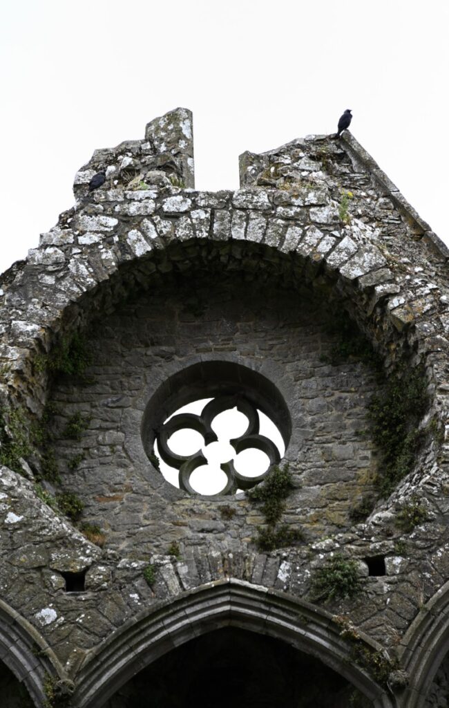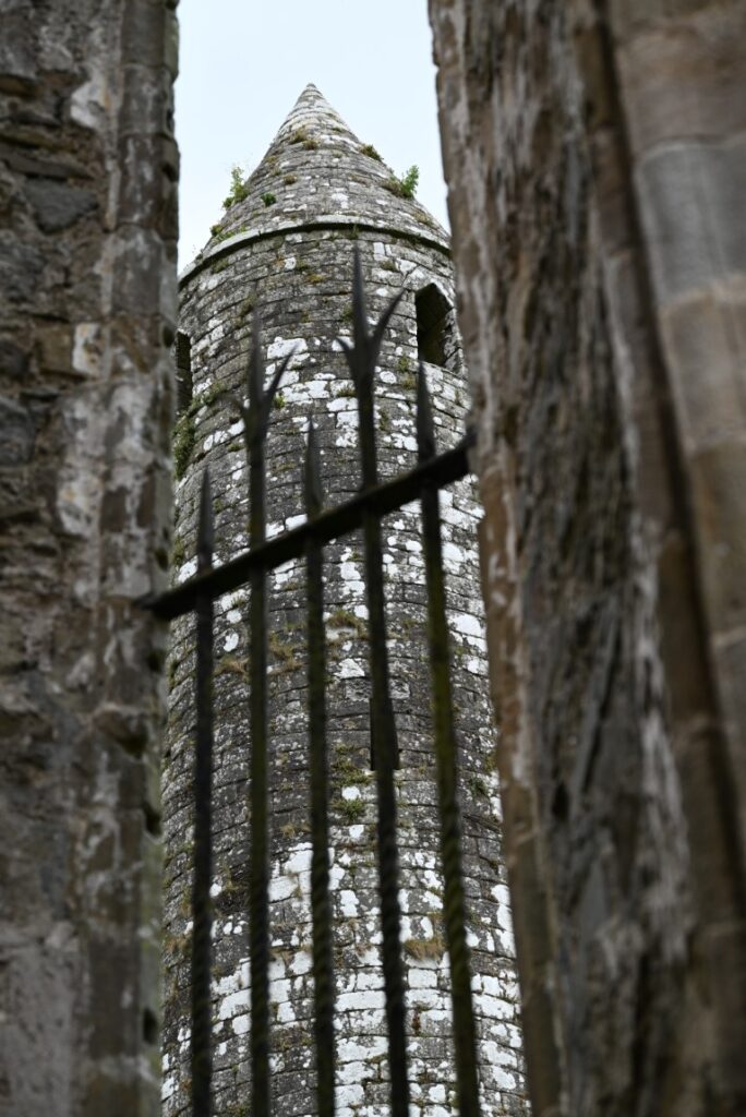 Among the ruins, the Round Tower stands as the oldest surviving structure, built around 1100 CE, just a year before the Rock was officially granted to the Church. Its slender, tapering form rises more than 28 meters above the ground and would have served as both a bell tower and a refuge in times of danger. Surrounding it are later medieval additions, including Cormac’s Chapel, an exquisite example of Romanesque architecture, and the imposing Cathedral, whose roofless walls still echo with the memory of centuries past.