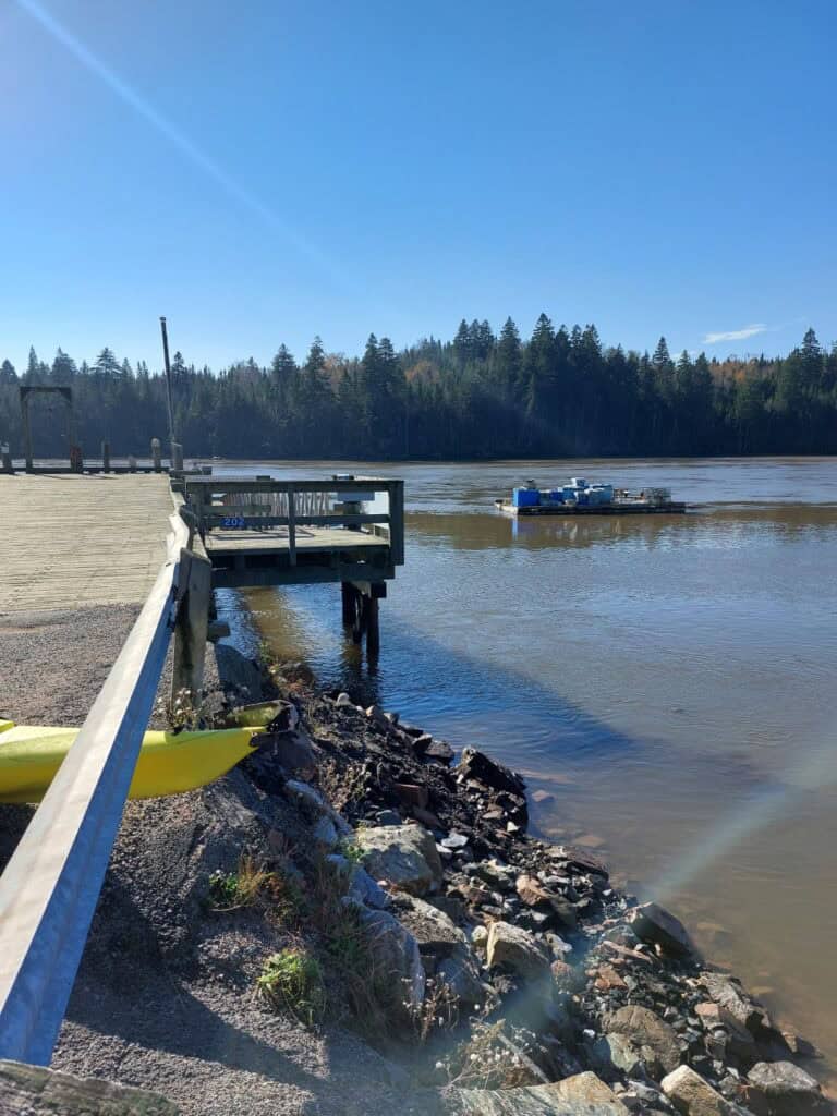 Five Fathom Hole is located at the mouth of the Musquash River before it enters Musquash Bay. And as you might expect from its location on the Bay of Fundy, it is heavily affected by the local tides. Expecting strong currents, we timed our put-in an hour before high tide to give us the best conditions for exploring at slack water. However, we instantly ran into several problems. The first was the launch site. While beautiful and worth the visit, the wharf at the end of Five Fathom Hole Road is not the “most accessible” launch site for paddlers. After offloading them, we shoved them beneath the guard rail and carefully lowered them over the steep, rock-lined embankment. From here, we had to get creative in how we entered them, but after a few close calls, were both in the river. The second issue was that by the time we were in the water, we were just 30 minutes before high tide or slack water. Despite this, the current moving around the fishing wharf and “upriver” was still very strong and once we launched, we delicately entered the fast-moving river before being pushed quickly upstream.