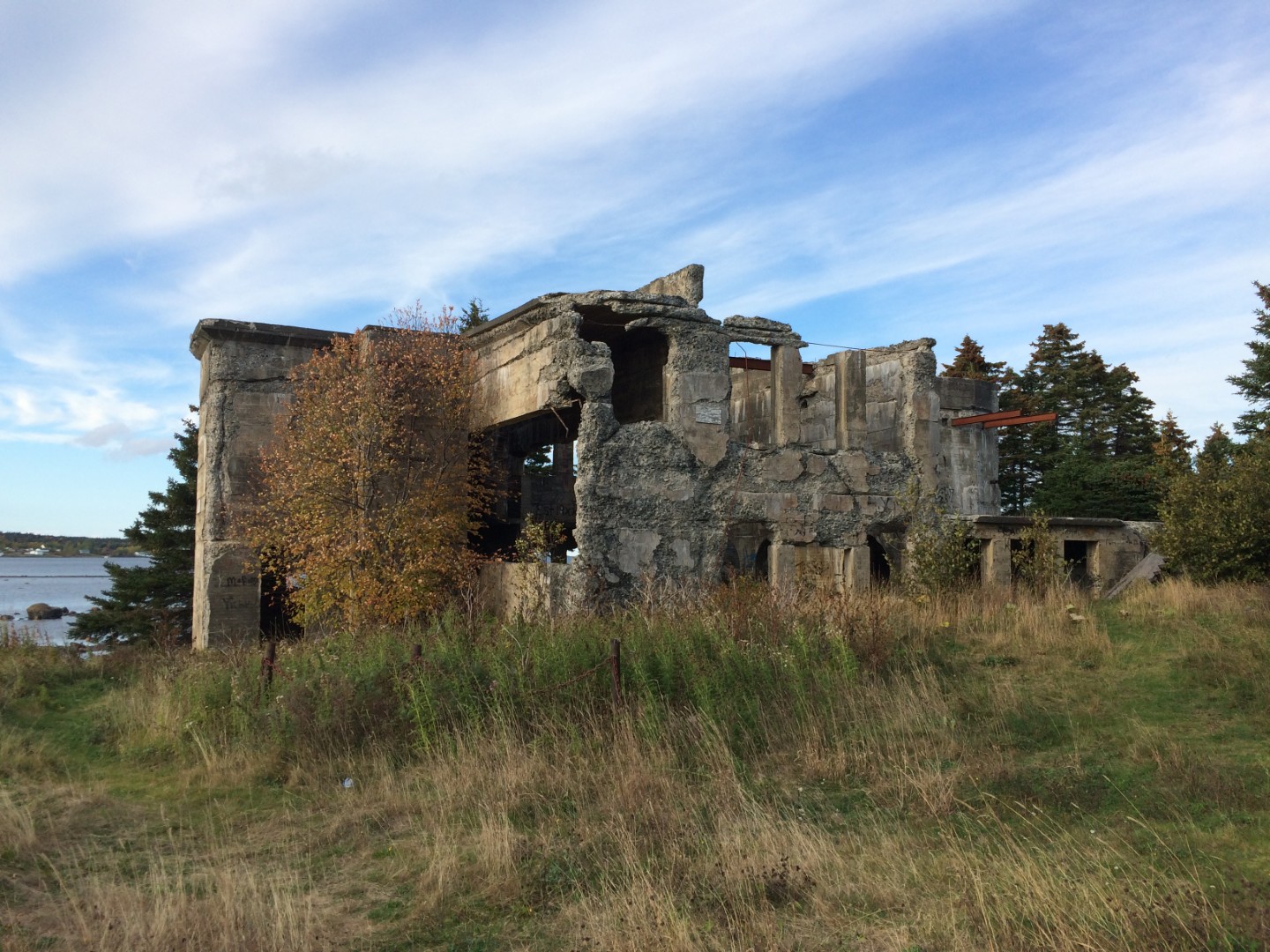In Central Newfoundland, along the shores of Notre Dame Bay, are the remains of the former Horwood Lumber Company pulp mill and its adjacent hydropower station. Having operated for only a short period in the early 1910s, the castle-like ruins overlooking Indian Arm are now a relic of a failed attempt to recreate the success of the nearby Grand Falls Pulp and Paper Mill and to establish Campbellton as a new economic hub in the region. This vision never came to fruition after the dam supplying the mill’s power failed, washing trees and even several buildings out into the harbour. Today, the powerhouse, wood grinders, concrete penstocks, and dam remain visible.