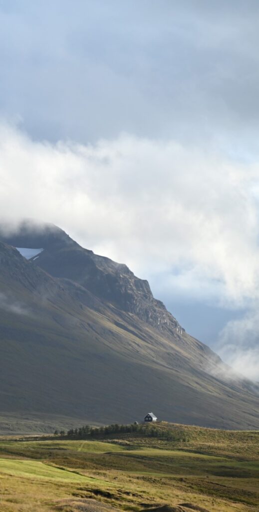 Exiting the tunnel’s west end, you quickly come into full view of Akureyri, its harbour, and the mountains it is nestled under. A cruise ship docked along the downtown gave a brief false impression of what the weather might be like, but this was no southern destination. As we turned across the causeway heading into the town center, we caught our first glimpse of snow falling in the surrounding mountains. Despite this, we stuck with our intention to camp that night closer to the East Fjords, and so we made a quick stop at the grocery store Hagkaup, where we resupplied with snacks, meals, and beer before continuing on.