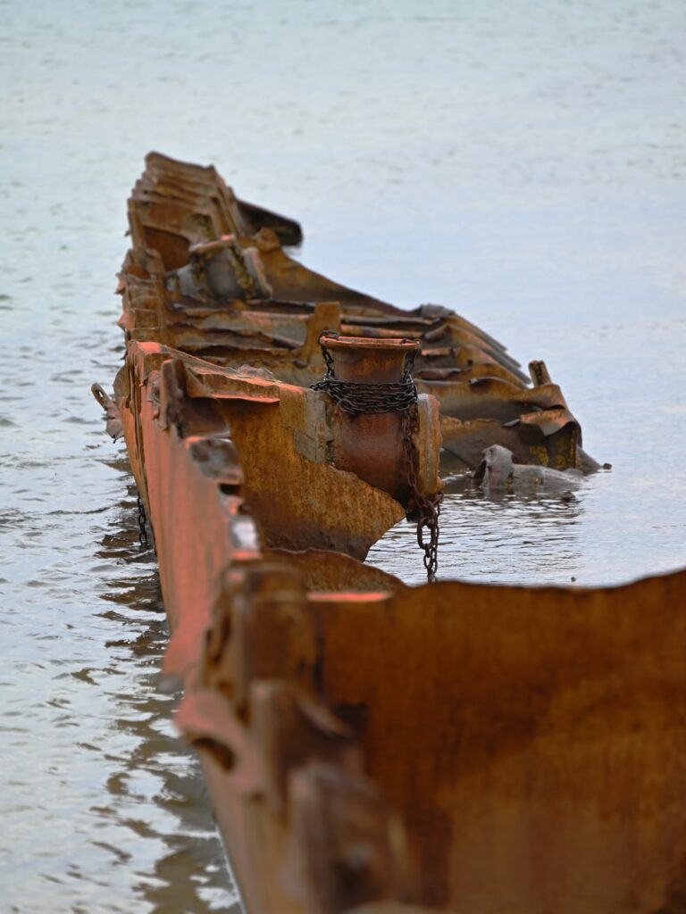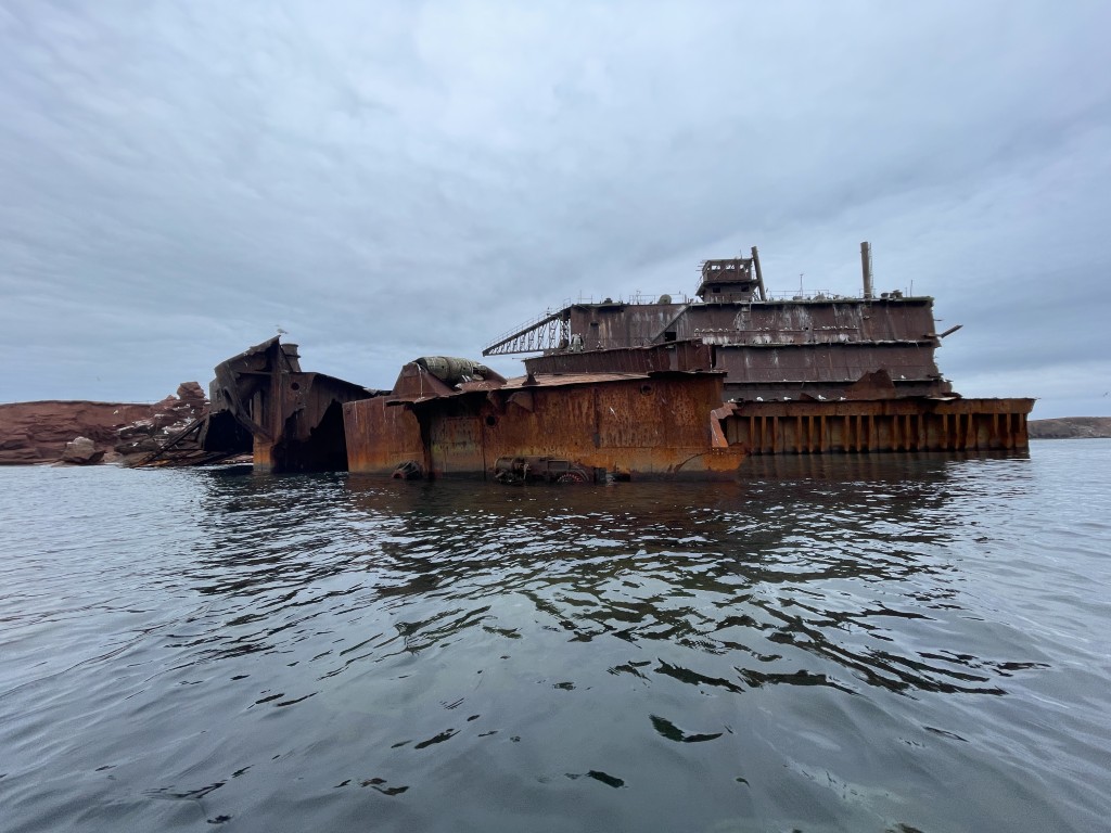 As the rain finally stopped, we drove back to L’Étang-du-Nord, launched our kayaks from a small fishing harbour and paddled out to the Duke of Connaught, an enormous floating drydock that was shipwrecked here after it’s tow line broke during a storm.