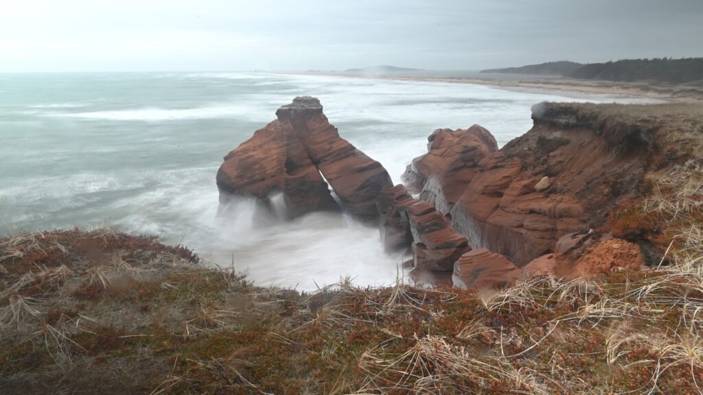 We continued to Île du Havre aux Maisons, where the fierce wind and rain kept us inside the car for some sightseeing along Cape Alright and the towering cliffs found along the east side of the island.