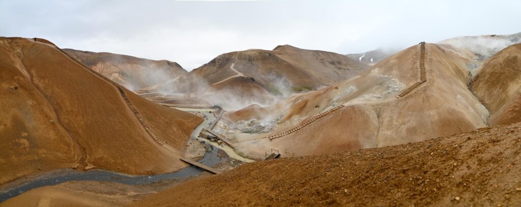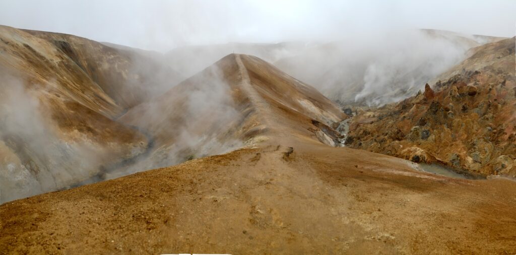 Kerlingarfjöll is one of Iceland’s active volcanic systems. Intense geothermal and volcanic activity beneath the mountains has produced a relatively shallow magma chamber. At Hveradalir, groundwater is superheated by this chamber and released through countless steam vents, boiling mud pots, and hot springs. The steam carries a strong sulfur smell, which can at times be overwhelming. Yet this same sulfur content, along with dissolved iron oxides and copper, has created the yellowish, reddish, and orange hues of the surrounding hills—earning Kerlingarfjöll the nickname “the Rainbow Mountains.”