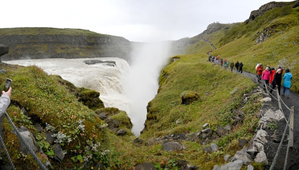 As we approached, views of the falls’ spray suggested its enormous size. But when we parked, we first decided to check out the jam-packed restaurant and gift shop near the trailhead, which sold both local and mass-produced Icelandic crafts and souvenirs.