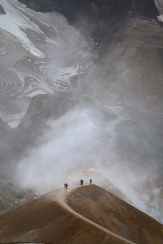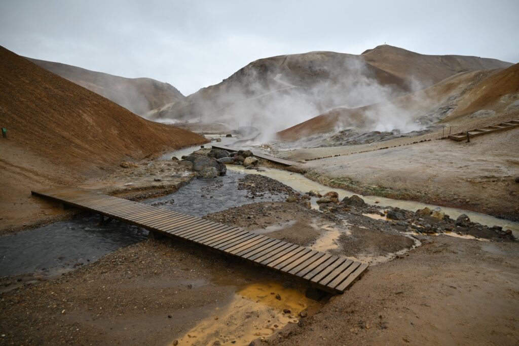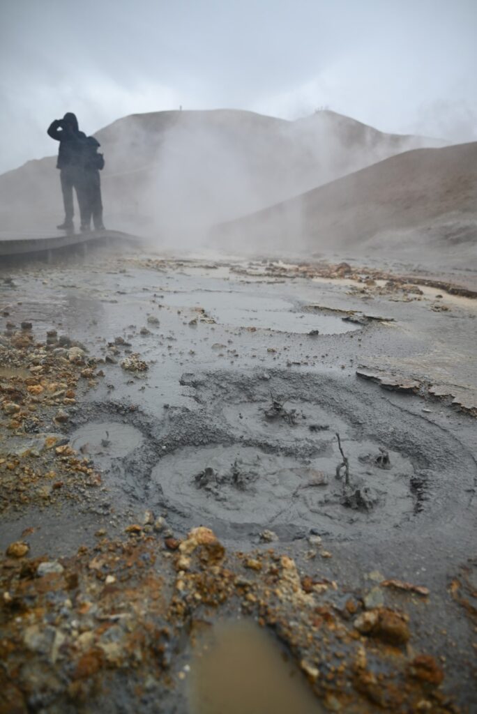 We saw only a handful of people heading back to their cars as we descended into the valley, and judging from their faces, they were either having the worst time of their lives or had embraced the weather with broad smiles. Fortunately, we channeled the latter. Soon the wind and rain faded from our minds as we caught sight of the brightly coloured ridges and hills, boiling puddles of clay and mud, and steaming vents that at times grew so thick they obscured the trail entirely. Not to sound too much like a cliché, but we had never been anywhere that felt so otherworldly.
