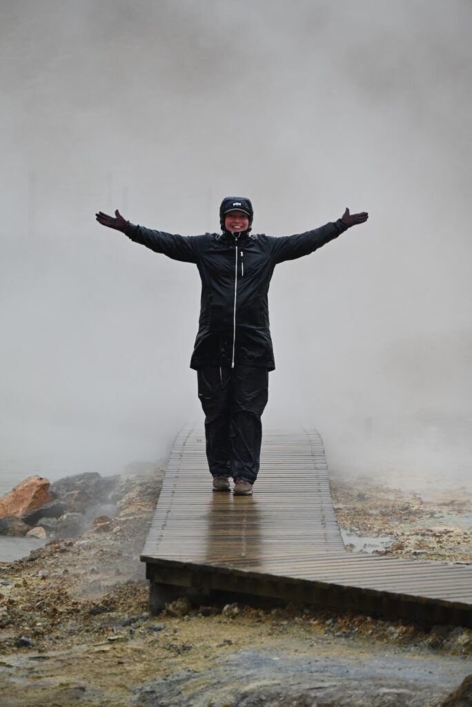 Once again, I say “overlooked,” but by this time we were high enough that we faced a constant downpour of wet snow and rain, accompanied by very strong winds. It was at this point we learned that Icelandic forecasts report wind in meters per second, not kilometers per hour—which makes a huge difference! With a deep breath and all our rain gear, we ventured out of the car. Within seconds we were soaked, which at least removed the pressure of trying to stay dry. The wind kept the fog away (along with any chance of hearing each other—or even our own breath). As we crossed a slippery, narrow ridge toward the geothermal area, we sometimes wished the fog would return to shelter us from the dizzying vertical drops on either side.
