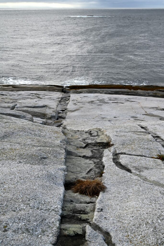 The geological processes that formed the granite composing Sambro Island also left behind a striking natural feature known locally as the “Devil’s Staircase.” Though it appears man-made—a seemingly perfect pathway etched into solid granite—it is, in fact, a natural intrusion dike. This formation occurred when hot magma pushed through a crack in the granite deep within Earth’s crust, slowly separating the parent rock. As granite is more erosion-resistant than the surrounding rock of the dike, the dike eroded more quickly, leaving behind a sunken formation resembling a staircase.