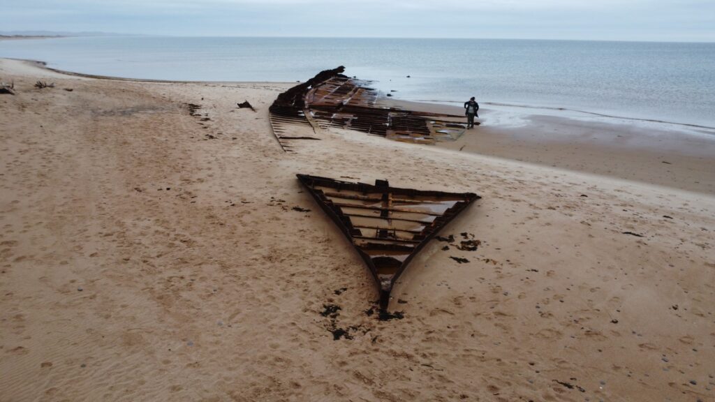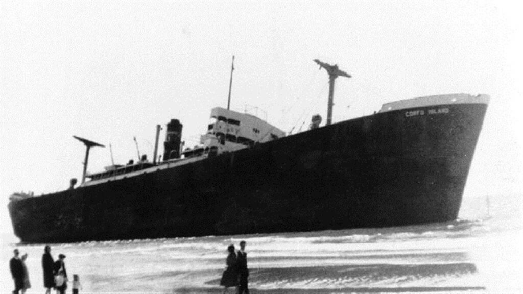 The ship at West Dune Beach was built in 1943 by North Vancouver Ship Repairs Limited. This steel-hulled vessel had a gross tonnage of 7,130 and measured 129.4 metres in length, 17.4 metres in beam, with a draft of 10.6 metres. Originally christened the Fort Saleesh, it was classified as a “Victory Ship,” a class of cargo ship constructed during the Second World War to transport personnel, supplies, and armaments across the Atlantic in support of the war in Europe. During the war, it operated under the control of the British Ministry of War Transport, carrying various cargoes vital to the war effort.